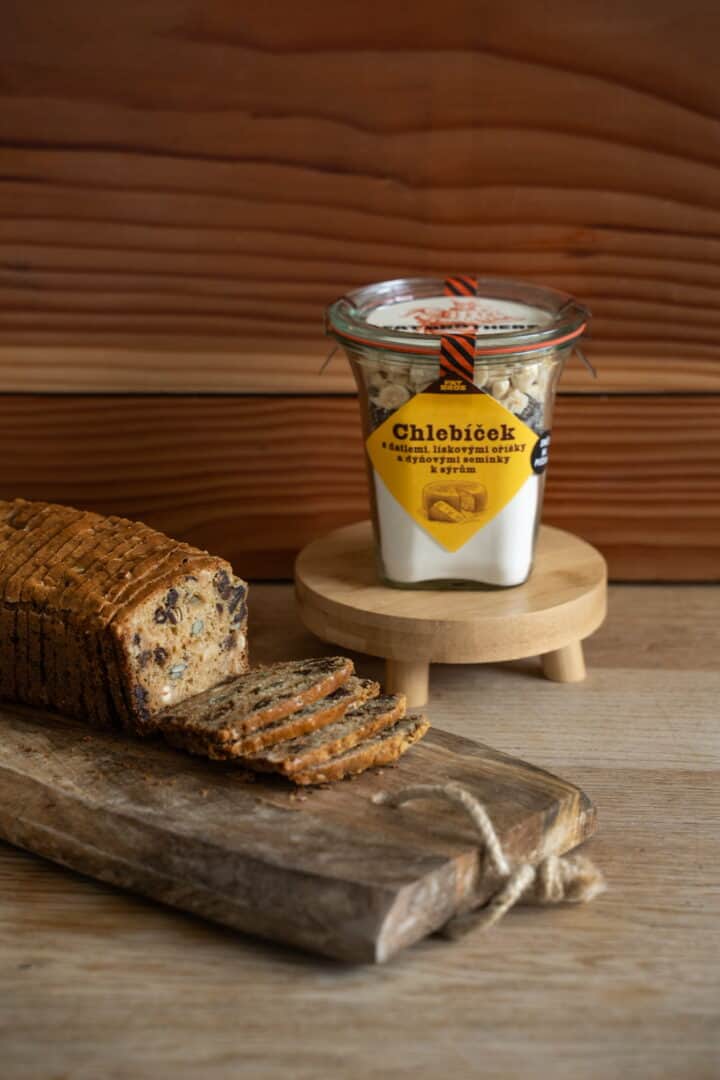 Eine Backmischung für französischen Lebkuchen aus glutenfreier Mehlmischung, Walnüssen, Orange und Rohrzucker in schönem Glas. Mit Honig, Ei und Butter verfeinern und fertig ist der perfekte Lebkuchen.