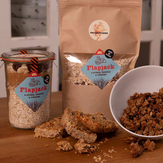 Flapjack mit Nüssen, Samen, Sauerkirschen und Banane - BackmischungZutaten: Haferflocken, Rohrzucker, Cashewnüsse, Mandeln, gefriergetrocknete Kirschen, Sonnenblumenkerne, gefriergetrocknete Banane.
