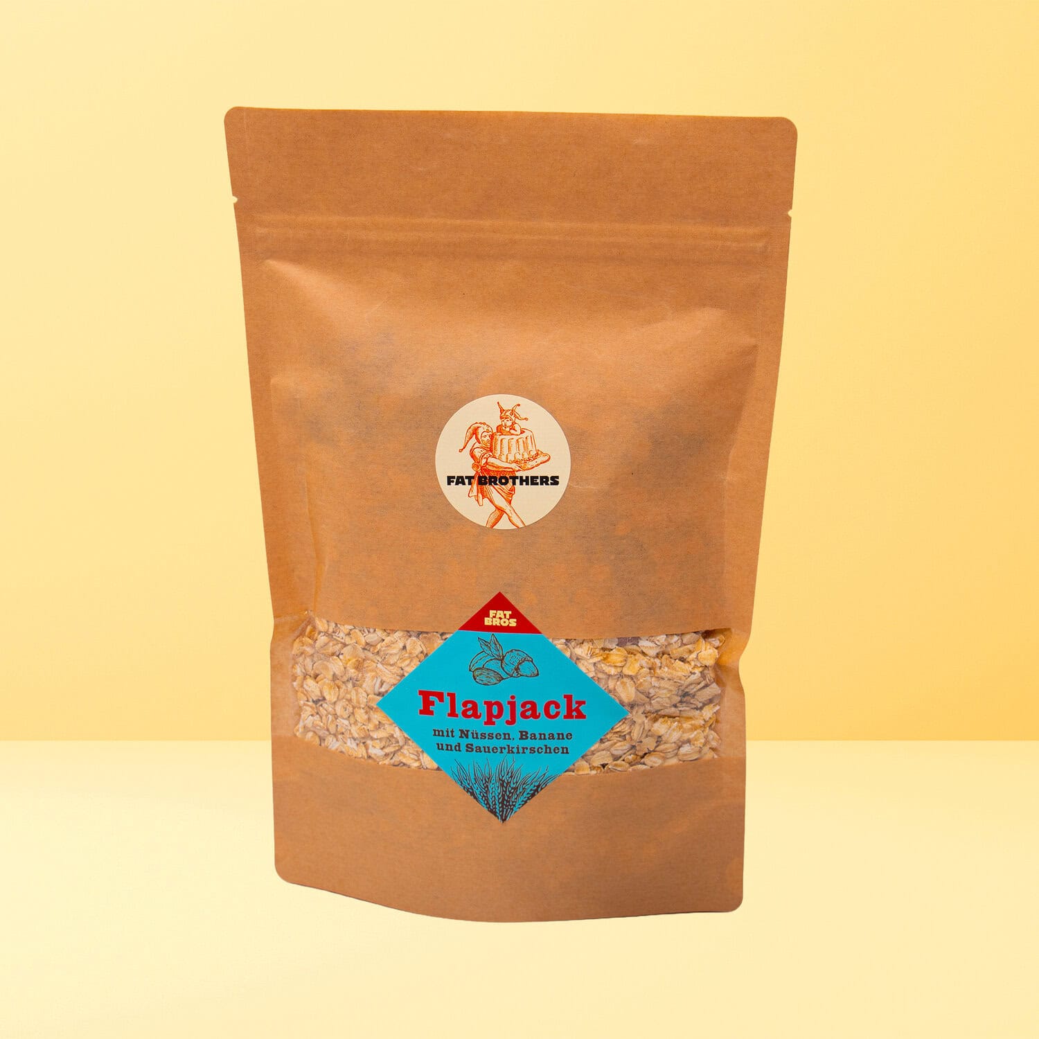 Zutaten: Haferflocken, Rohrzucker, Cashewnüsse, Mandeln, gefriergetrocknete Kirschen, Sonnenblumenkerne, gefriergetrocknete Banane.